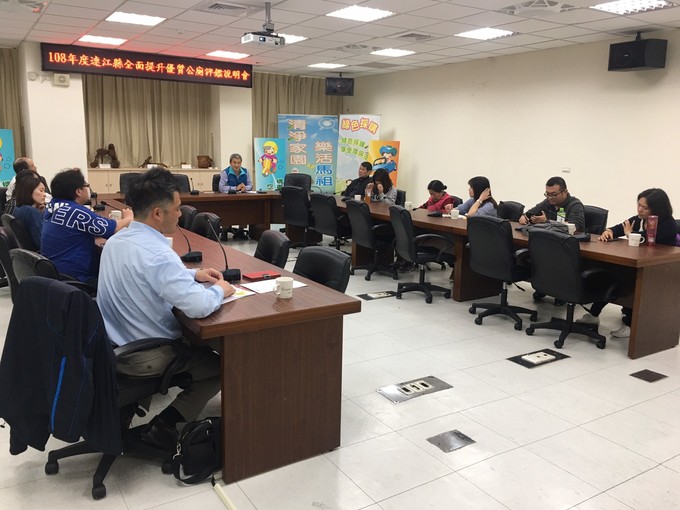 環資局推動公廁評鑑制度說明會 --閱讀人次 : 608 連江縣環境資源局(以下簡稱環資局)為持續提昇公廁品質,於108年04月19日由環資局副局長林宜華親自主持「108年度連江縣全面提升公廁精進計劃評鑑說明會」,並邀集行政處、文化處、教育處、港務處、交通旅遊局、馬祖酒廠實業股份有限公司、馬管處、北竿航空站、南竿航空站、南竿鄉公所、北竿鄉公所、莒光鄉公所及東引鄉公所等各公廁管理單位,共同推動公廁評鑑制度。