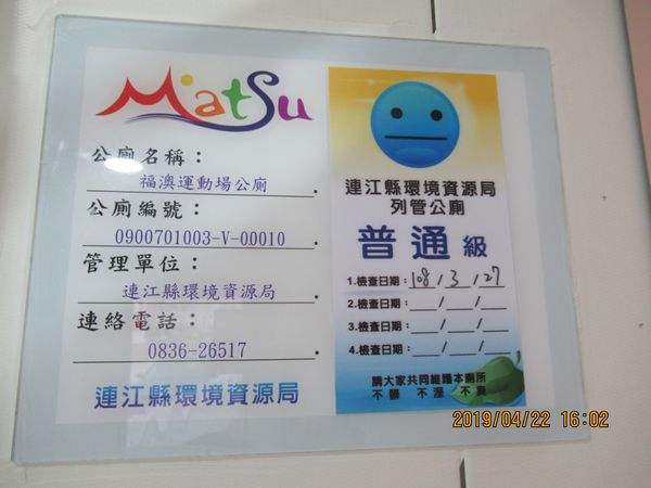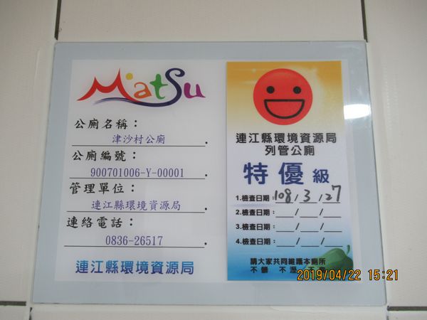 第一季縣內列管公廁評鑑結果 --閱讀人次 : 890 連江縣環境資源局(以下簡稱環資局)持續執行縣內列管公廁評鑑,在108年度第一季評鑑之中,特優級達31處、優等級達7處,普通級達19處,環資局表示,今年將繼續推動公廁品質精進,輔導各列管公廁成績持續進步,並逐年進行公廁品質提升。