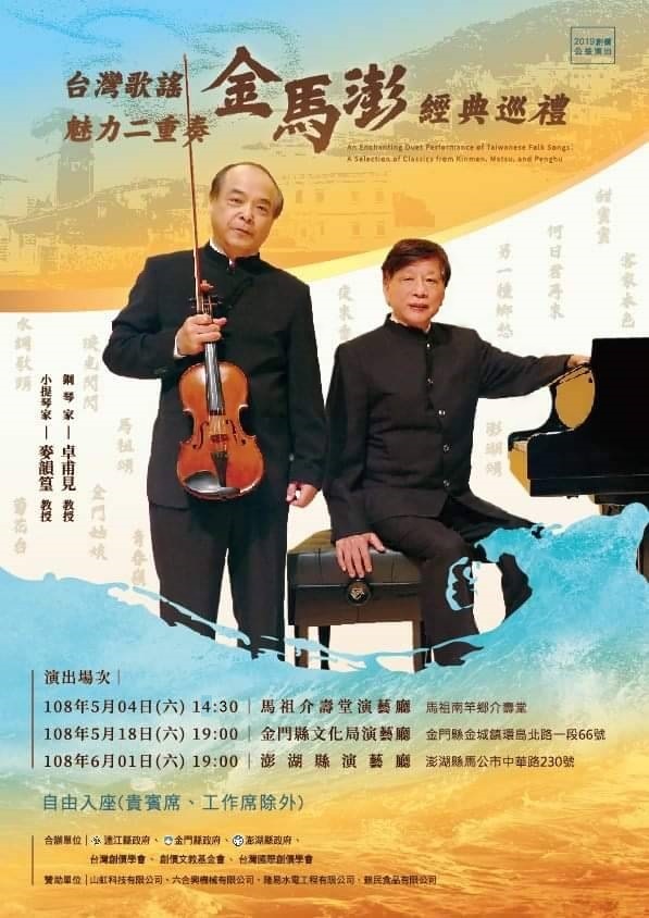 5/4台灣歌謠魅力二重奏-金馬澎經典巡禮 --閱讀人次 : 933 為讓優質文化藝術普及台灣各個角落,台灣創價學會特別策劃並與連江縣政府合辦「台灣歌謠魅力二重奏-金馬澎經典巡禮」,邀請活躍於全台各地、廣受喜愛,並曾榮獲「建國百年藝術成就獎」的著名鋼琴家卓甫見、小提家麥韻篁,於金門馬祖澎湖等三地,跨島義演。此次希冀透過兩位音樂家以鋼琴與小提琴生動活潑的演奏,讓馬祖居民聆聽到耳目一新的台灣經典歌謠。