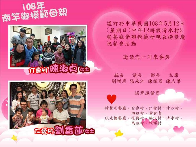 南竿鄉公所慶祝108年母親節餐會活動 --閱讀人次 : 1428 為慶祝108年母親節,南竿鄉公所於5月12日(星期日)中午12時舉行108年南竿鄉母親節表揚模範母親暨慶祝餐會活動,邀請地區媽媽們參加。