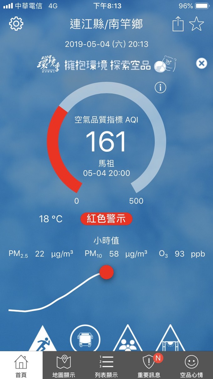 依據環保署今日(5月04日)下午19時空氣品質監測結果,馬祖地區受境外污染物影響,空氣品質指標AQI為161,對所有族群不健康,環境資源局提醒您