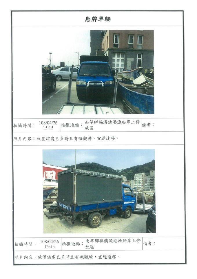 主旨:公告南竿鄉福澳漁港漁船岸上停放區無牌車輛1輛。