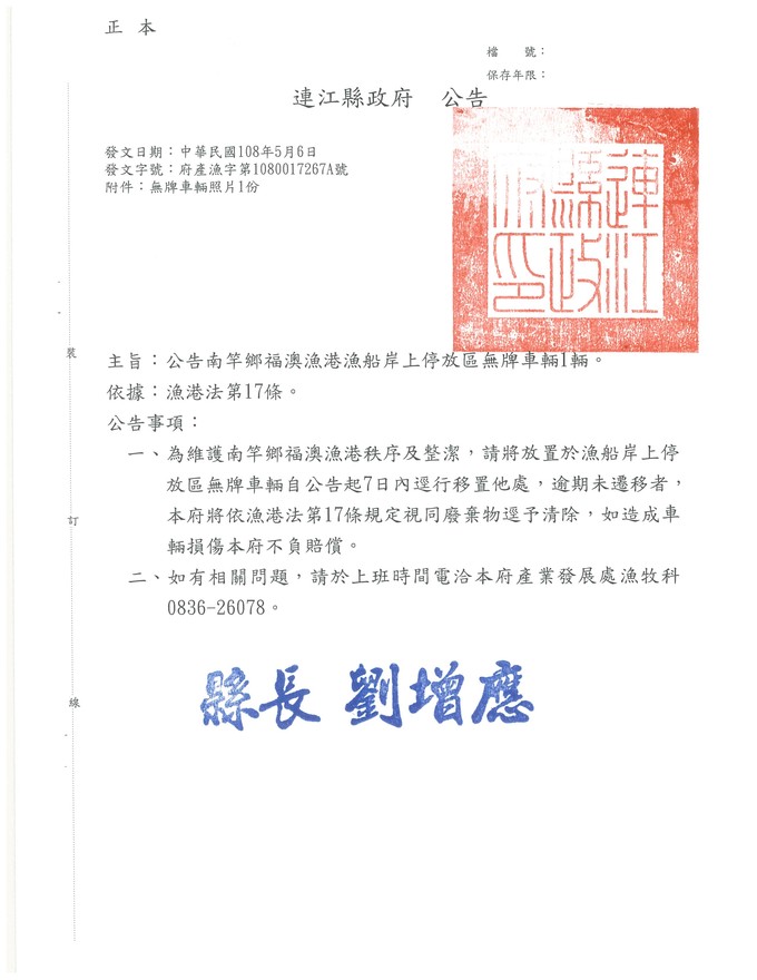 一、為維護南竿鄉福澳漁港秩序及整潔,請將放置於漁船岸上停放區無牌車輛自公告起7日內逕行移置他處,逾期未遷移者,本府將依漁港法第17條規定視同廢棄物逕予清除,如造成車輛損傷本府不負賠償。