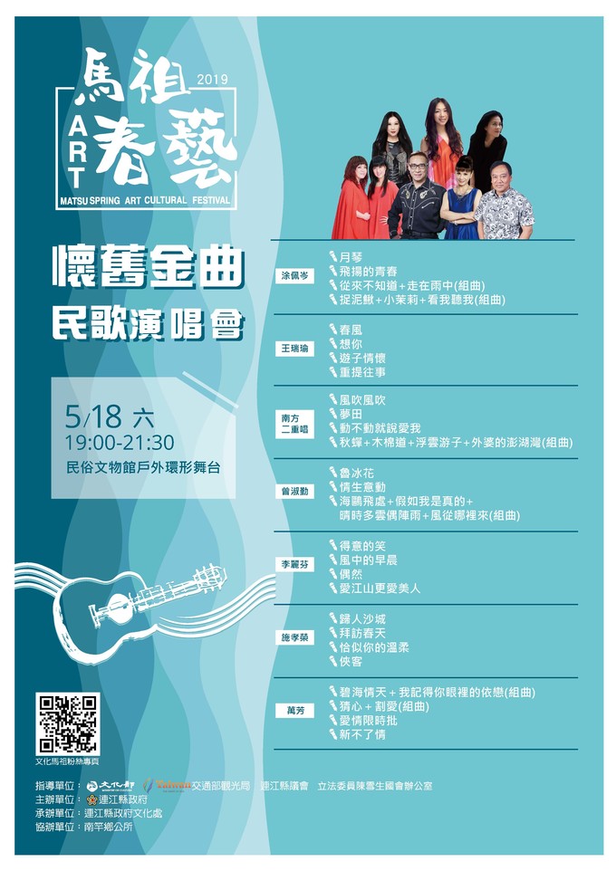 馬祖春藝─民歌演唱會將於5月18日在民俗文物館戶外環形舞台演出,歡迎鄉親前來參加