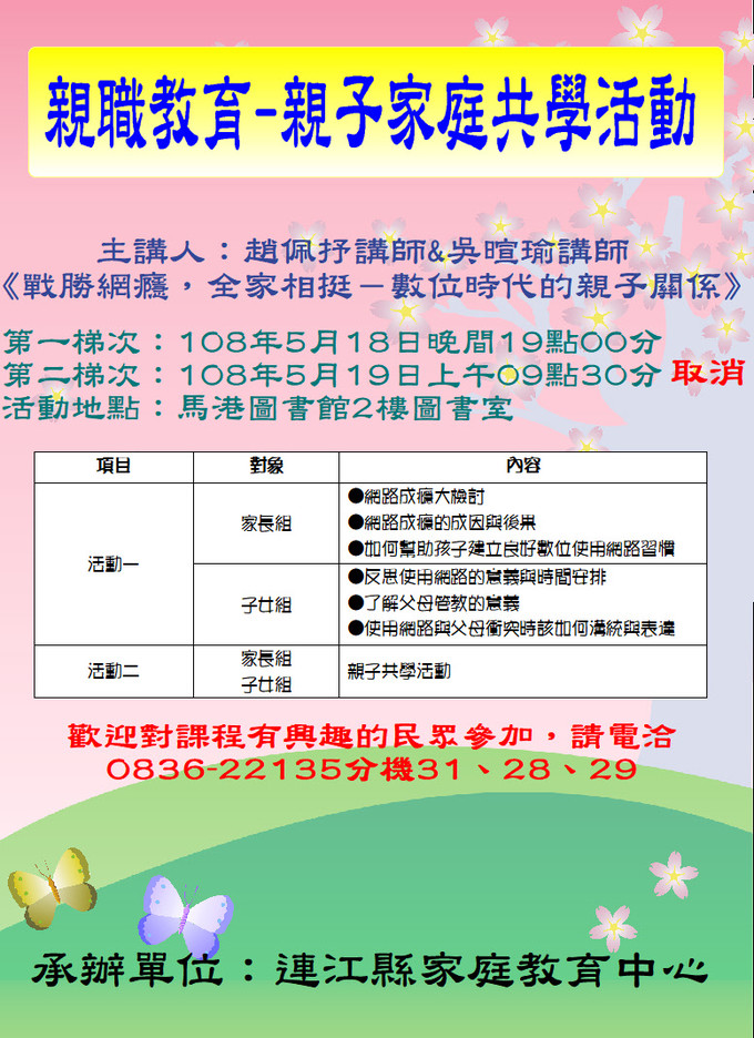 原定5月19日(星期日)上午9點30分於馬港圖書館2樓圖書室辦理「親職教育-親子家庭共學活動」,