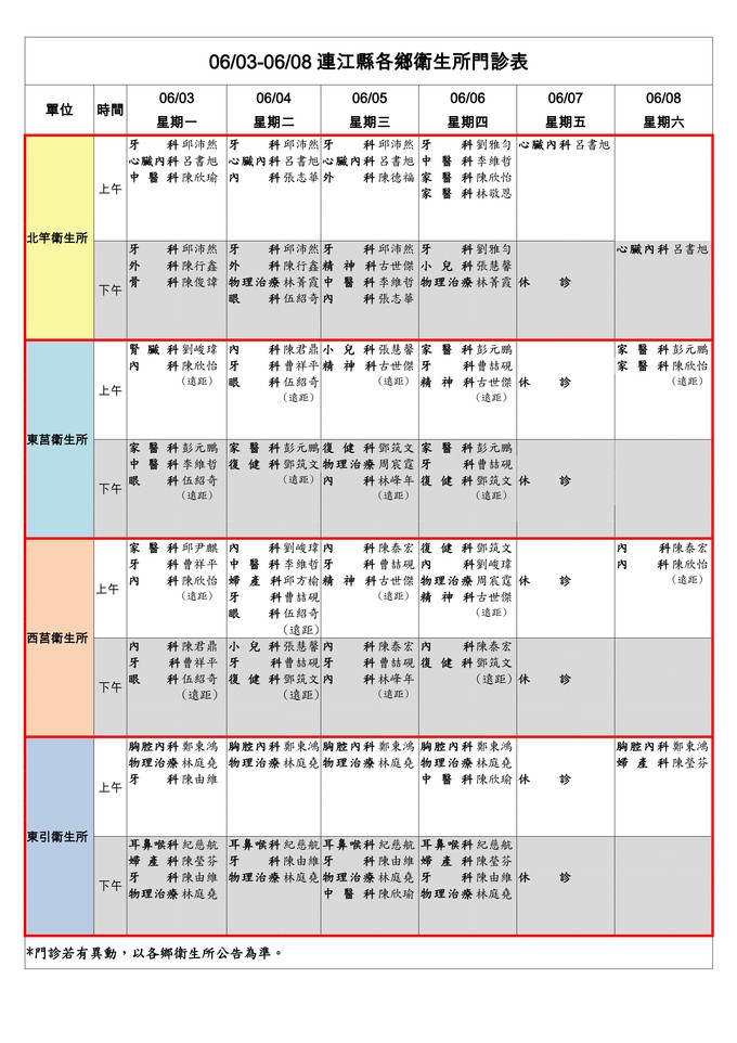 0603-0608連江縣各鄉衛生所門診表