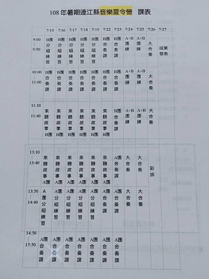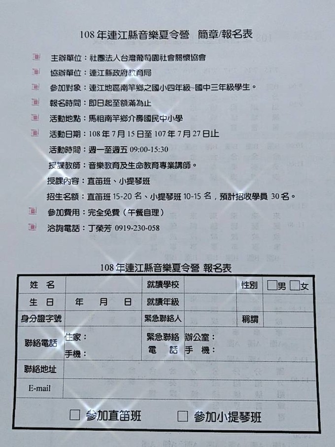 一、108年連江縣音樂夏令營(簡章/報名表及課程參附檔),費用無。