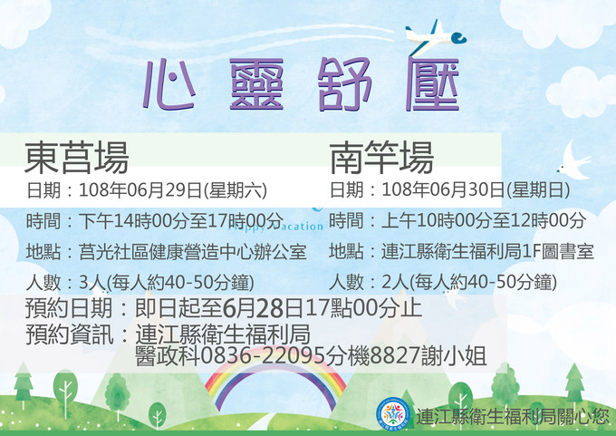 心靈紓壓心理駐點諮詢服務6/29(東莒場) 06/30(南竿場)