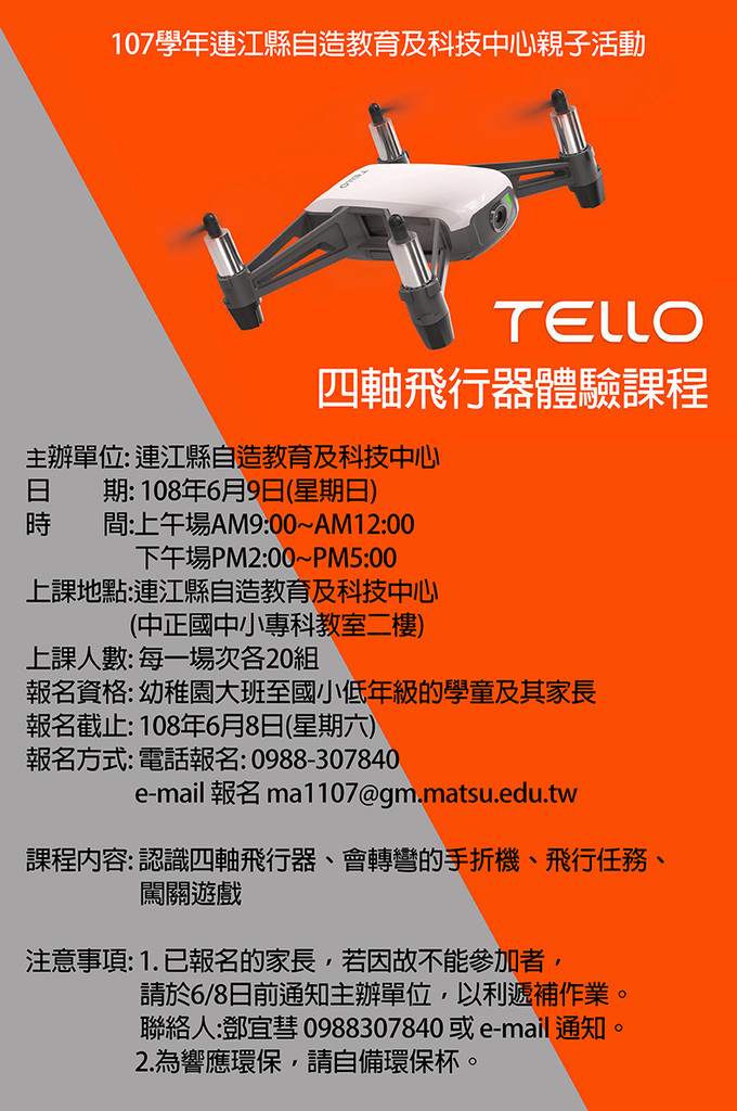 親愛的家長們,連江縣自造教育及科技中心將於6/9星期日舉辦四軸飛行器親子體驗活動,歡迎家有幼稚園大班至小學低年級的爸爸、媽媽們,帶著你們的寶貝來科技中心體驗時下最流行的四軸飛行器(空拍機),並進一步認識無人機將在我們未來的生活中扮演著如何重要的角色。