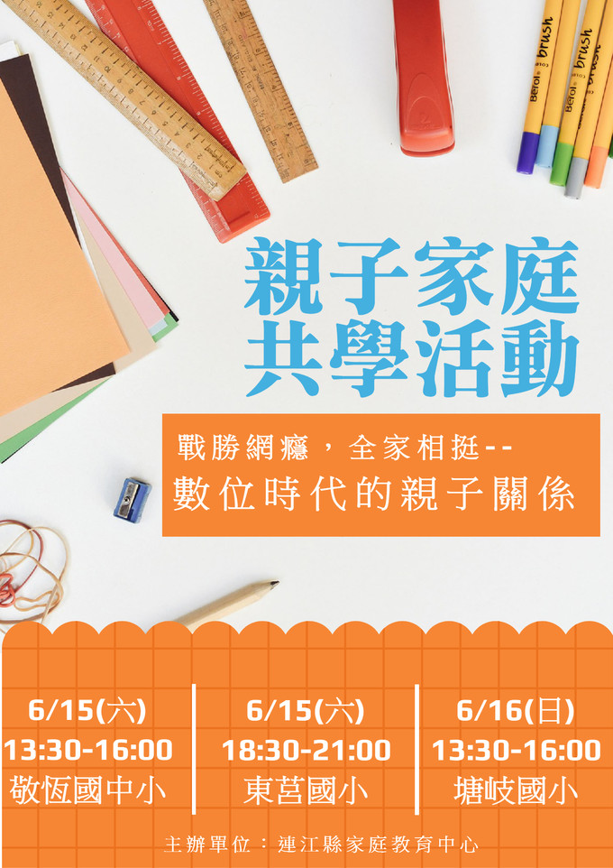 邀請到國立台灣師範大學人類發展與家庭學系生活教育碩士陳柏亨講師及簡耀講師擔任主講人,課程內容為家長組及子女組分別進行,最後再透過親子互動環節,體會親子溫馨時刻。期待能幫助家長了解網路成癮的成因及預防方法,並引導孩子認識網路、學習與父母溝通協商合宜的使用規範,同時達到增進親子關係的效果。歡迎父母帶著子女踴躍參加,凡參與者將獲得精美禮品1份。