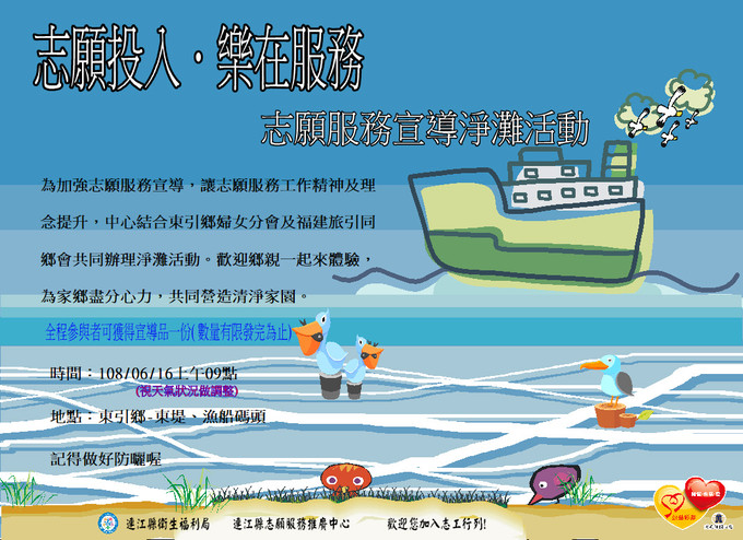 為加強志願服務宣導,讓志願服務工作精神及理念提升,中心結合東引鄉婦女分會及福建旅引同鄉會共同辦理淨灘活動。歡迎鄉親一起來體驗,為家鄉盡分心力,共同營造清淨家園。