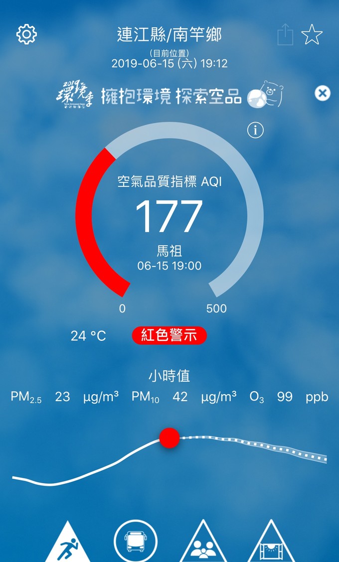 依據環保署今日(6月15日)下午19時空氣品質監測結果,馬祖地區受境外污染物影響,空氣品質指標AQI為177,對所有族群有影響,環境資源局提醒您