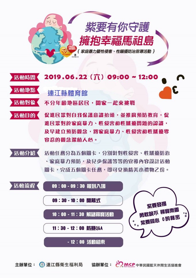 6/22紫要有你守護-擁抱幸福馬祖登場! --閱讀人次 : 1313 108年『紫要有你守護,擁抱幸福馬祖』家庭暴力暨性侵害、性騒擾防治宣導活動,原在介壽沃口公園,因考慮雨天改在體育館辦理哦!