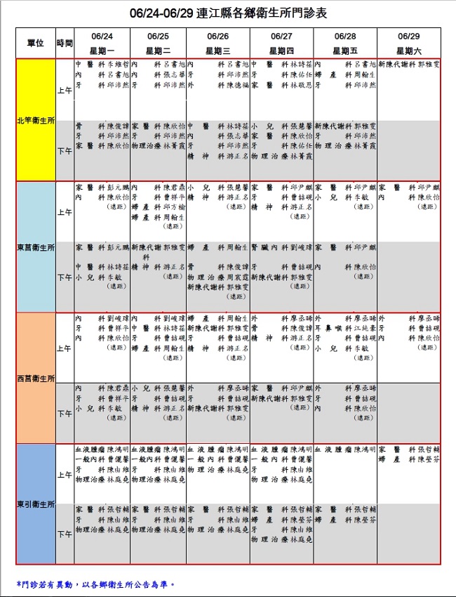 06/24-06/29連江縣各鄉衛生所門診表