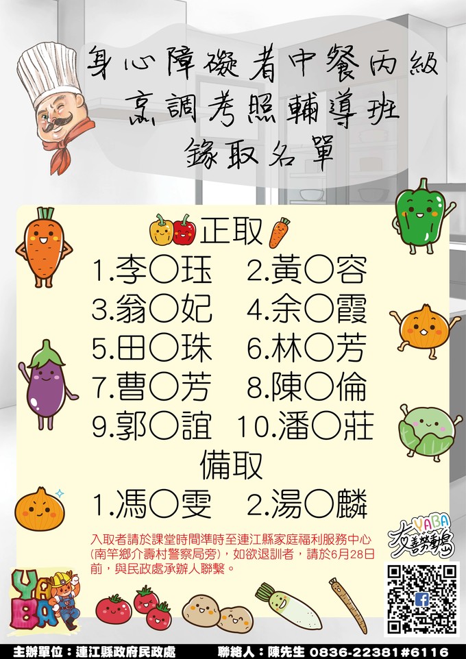 身障者中餐丙級烹調考照輔導班錄取名單
