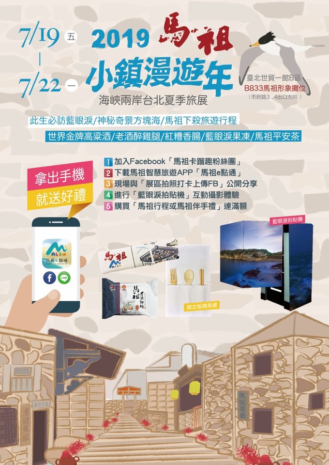 馬祖2019年北竿與莒光兩島入選經典小鎮,藍眼淚、方塊海、芹壁聚落、梅花鹿及黑嘴端鳳頭燕鷗等觀光資源豐富,今年特籌劃老兵重返、莒光婚紗補助及定向越野競賽等系列活動,讓島上全年度活動不斷、熱鬧非凡,並擁有立榮航空、台馬之星等海空便捷交通方式,吸引世界各地遊客登島體驗馬祖迷人魅力;7月19日至7月22日快來台北夏季旅展,安排一趟此生必訪、絕美勝境的馬祖之旅吧!