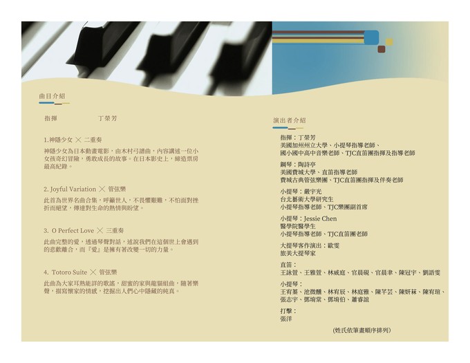小提琴:王宥蓁、池微醺、李和融、林宥辰、林庭雅、陳芊芸、陳妍菻、陳宥瑄、張志宇、鄧堉棠、鄧堉柏、蕭睿誼