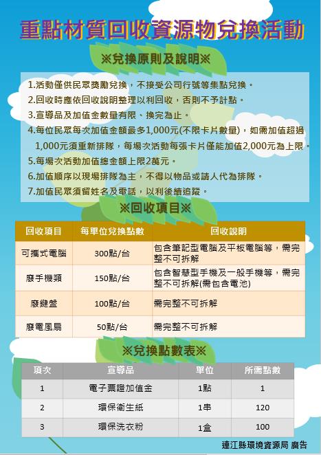 環資局指出,兌換活動將以平常不易回收之資源回收物為主,包含廢筆電(包含平板電腦)300點/台、廢手機(智慧型手機及一般型手機)150點/台、廢鍵盤100點/把、廢電風扇50點/把,提醒大家回收應保持機體完整性,切勿自行拆解,兌換之點數可選擇生活宣導品:電子票證加值金(1點/元)、環保衛生紙(120點/串)、環保洗衣粉(100點/盒)。