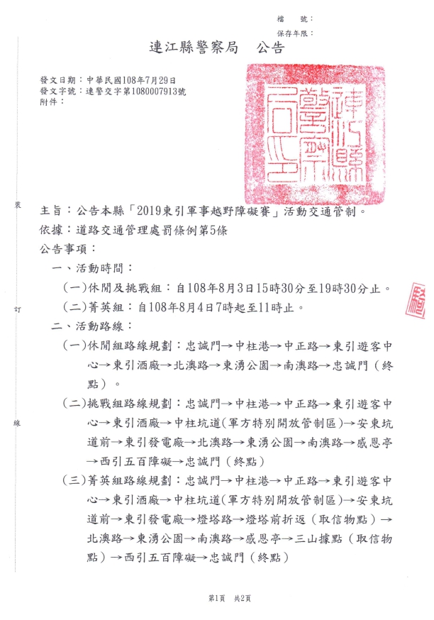 2019東引軍事越野障礙賽活動交管公告