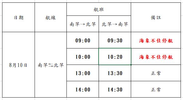 8/10 因受利奇馬颱風影外圍影響,海象不佳南北竿航班異動如下: