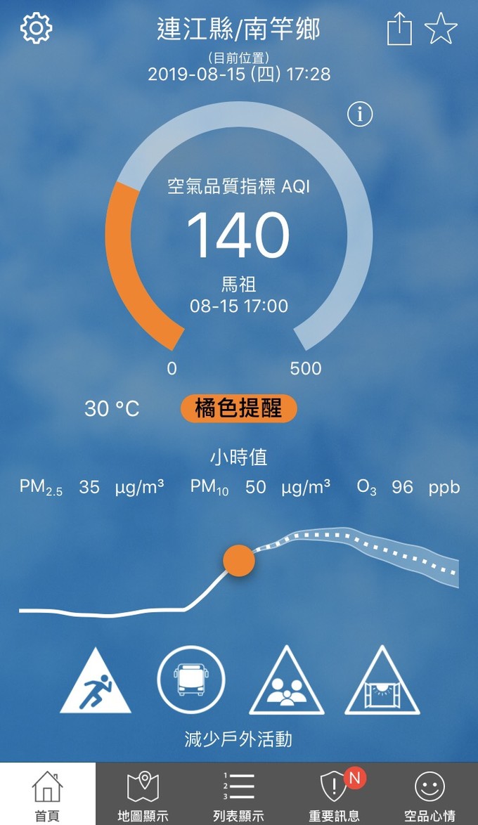 依據環保署今日(8月15日)下午17時空氣品質監測結果,馬祖地區受境外污染物影響,空氣品質指標AQI為140,對敏感族群有影響,環境資源局提醒您