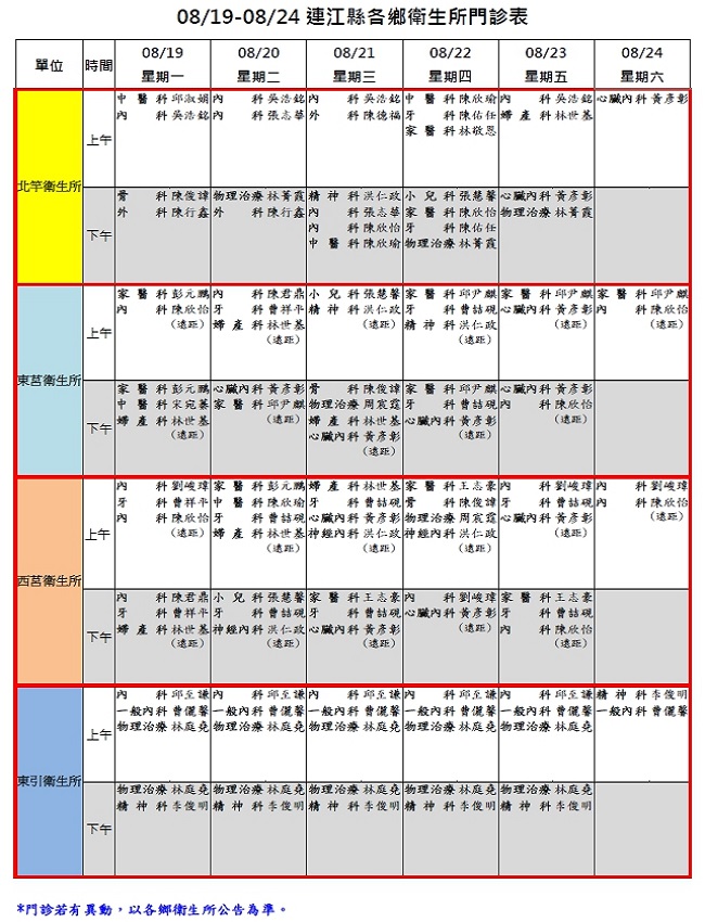 8/19 - 8/24 連江縣各鄉衛生所門診表