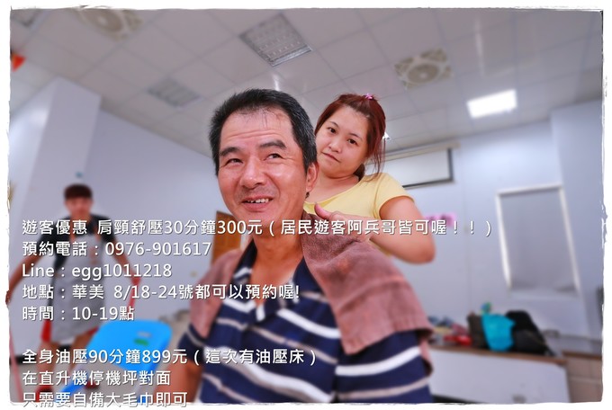 遊客優惠 肩頸舒壓30分鐘300元(居民遊客阿兵哥皆可喔!!)