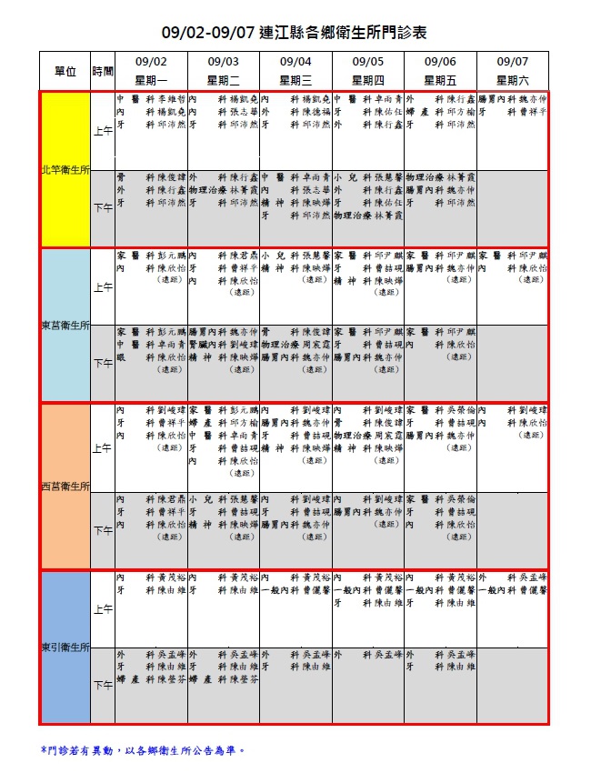 9月2日-9月7日連江縣各鄉衛生所門診表