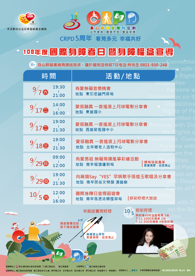 衛福局訂於9月7日起舉辦7場別開生面的國際身心障礙者日系列活動,分別是9月7日東引鄉有愛無礙音樂晚會,9月17日及18日在東西莒與北竿鄉舉辦一首搖滾上月球電影分享會,9月29日上午與晚間在南竿鄉舉辦有愛馬祖無愛飛揚-風箏彩繪及知名視障歌手張瓊玉演唱及演說活動,10月5日在南竿鄉舉辦國際身心障礙者日宣導園遊會與闖關摸彩活動。