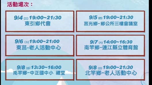 因氣候關係,東莒場改為9/6號,晚間19:00~21:00,老人活動中心。