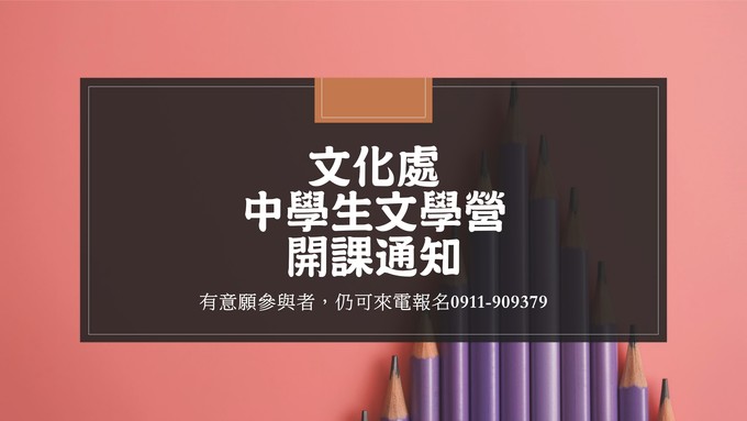 文化處中學生文學營 在地作家無私領航 --閱讀人次 : 1385 原定於8月23日至8月25日舉辦的「馬祖在地作家養成計畫-中學生文學營」,因颱風來攪局,打亂講師航班及行程而暫停。在各方協調與重新規劃後,將於本週末9月7日、8日開課。除了原本已報名的學員,也非常歡迎尚未報名的國、高中生來電報名(0911-909379)。