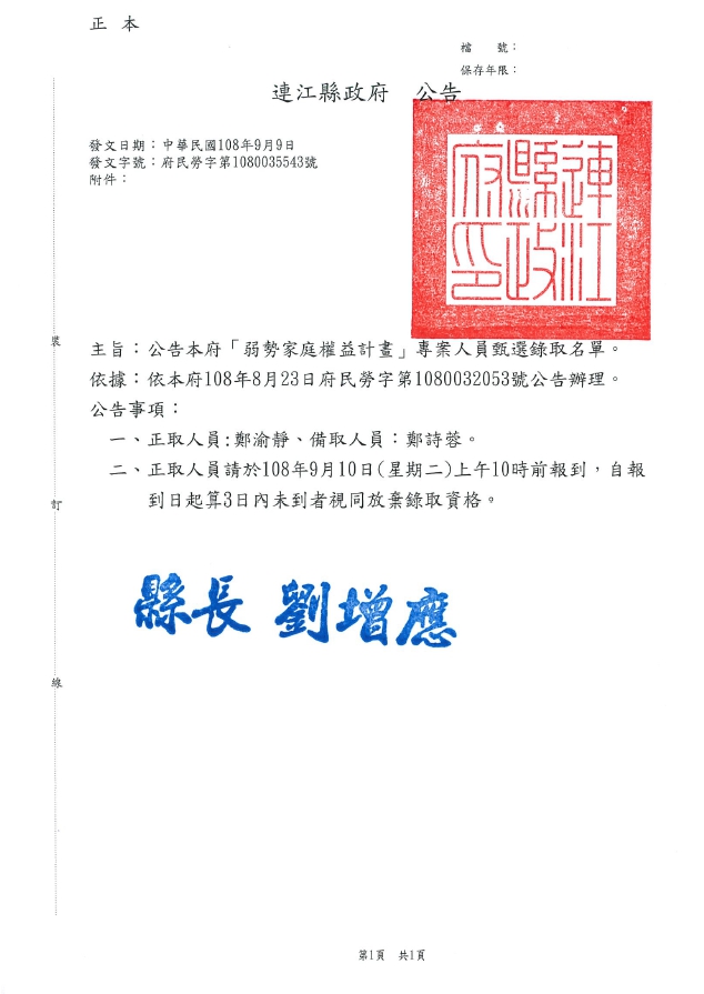 弱勢家庭服務計畫專案人員錄取公告