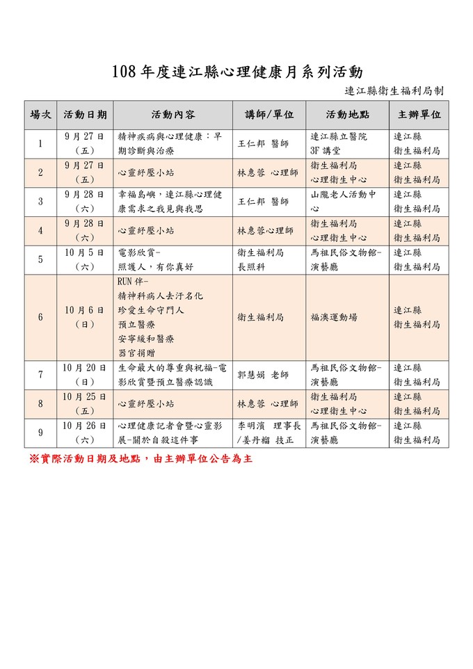 今年本縣「心理健康月」已邁入第4個年頭,自9月份開始至10月下旬止,共同推動心理健康促進靜態或動態活動,除了提供紓壓講座、社區心靈紓壓活動外,還結合心靈影展、運動、等活動,提高心理韌力強度,讓生活體驗更佳豐富有趣,以提升縣民的照護自我心理健康,以符本縣「健康島嶼、幸福馬祖」的施政主軸。