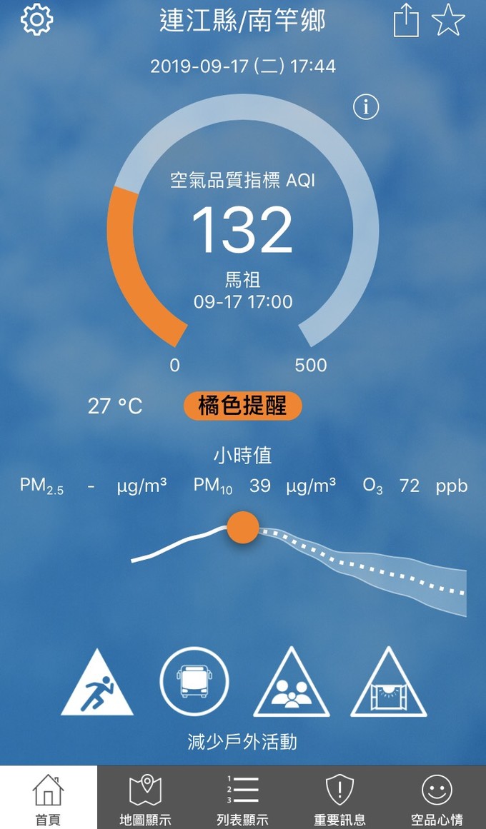 依據環保署今日(9月17日)下午17時空氣品質監測結果,馬祖地區受境外污染物影響,空氣品質指標AQI為132,對敏感族群有影響,環境資源局提醒您
