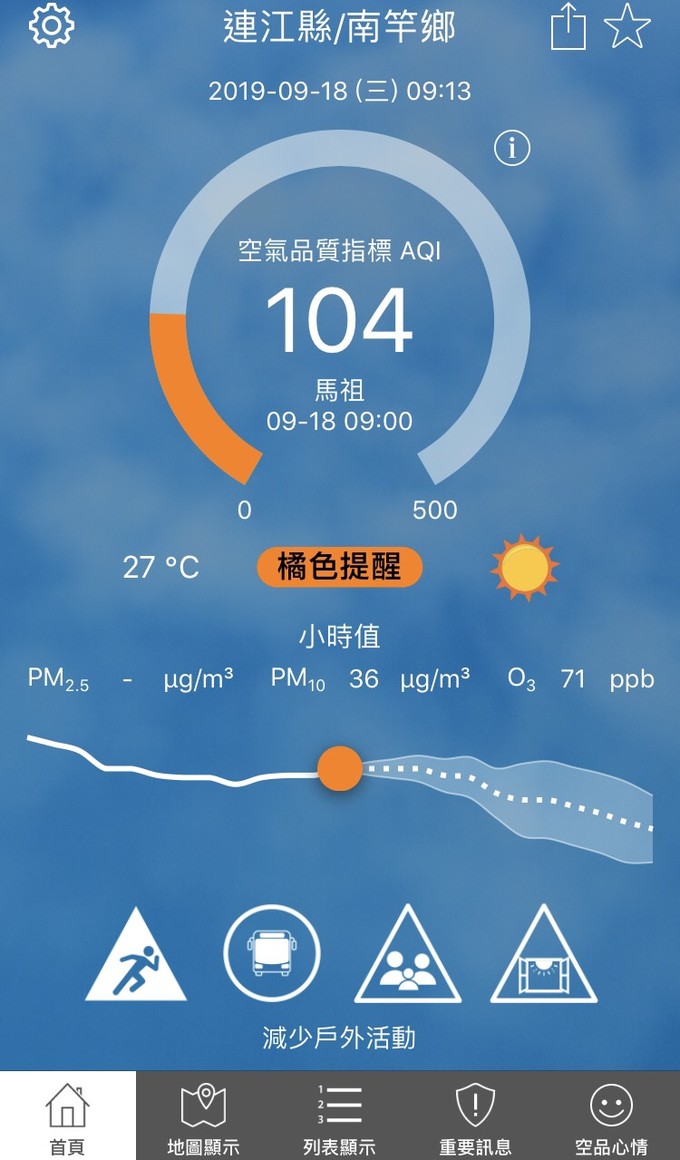 依據環保署今日(9月18日)上午09時空氣品質監測結果,馬祖地區受境外污染物影響,空氣品質指標AQI為104,對敏感族群有影響,環境資源局提醒您