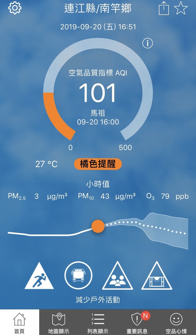 依據環保署今日(9月20日)下午16時空氣品質監測結果,馬祖地區受境外污染物影響,空氣品質指標AQI為101,對敏感族群有影響,環境資源局提醒您