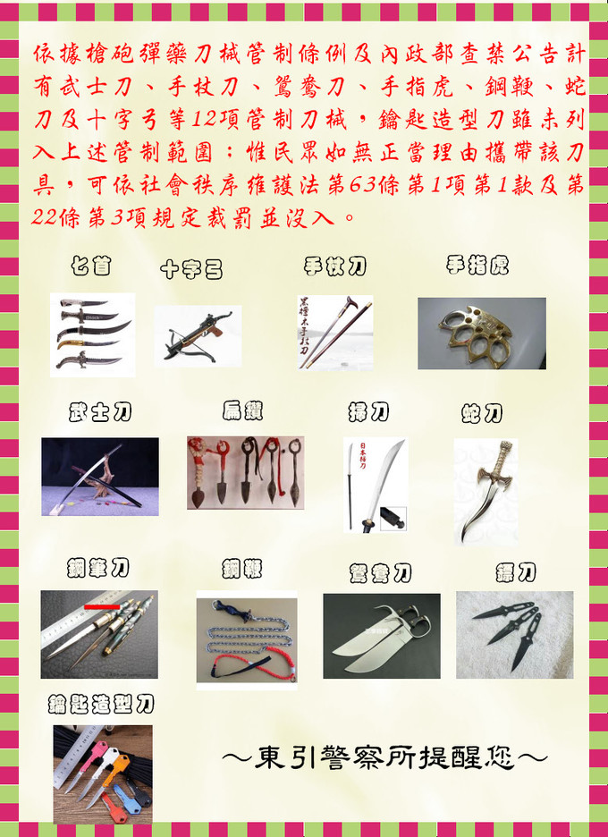 依據槍砲彈藥刀械管制條例及內政部查禁公告計有武士刀、手杖刀、鴛鴦刀、手指虎、鋼鞭、蛇刀及十字弓等12項管制刀械,鑰匙造型刀雖未列入上述管制範圍;惟民眾如無正當理由攜帶該刀具,可依社會秩序維護法第63條第1項第1款及第22條第3項規定裁罰並沒入。