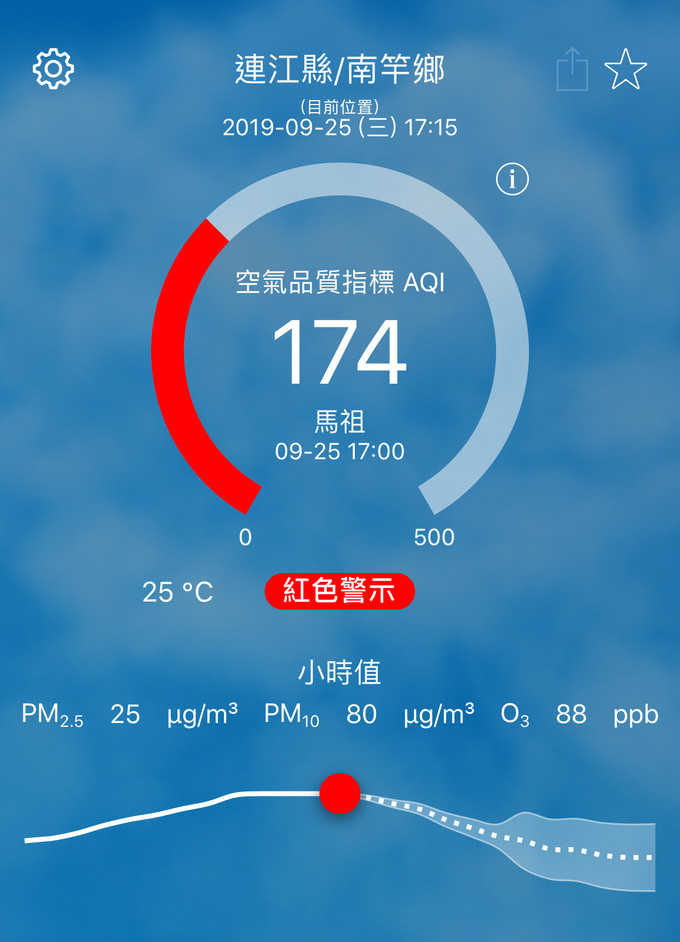 09/25空氣品質指標AQI 174 --閱讀人次 : 469 依據環保署今日(9月25日)下午17時空氣品質監測結果,馬祖地區受境外污染物影響,空氣品質指標AQI為174,對所有族群不健康,環境資源局提醒您