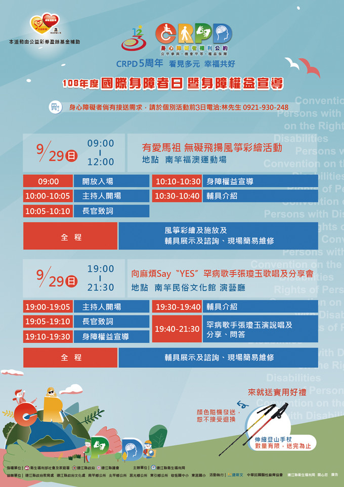 9月29日上午9時在福澳運動場舉辦的風箏彩繪活動,只要到現場就可免費獲得彩繪風箏(數量有限送完為止),晚上7時在民俗文物館演藝廳舉辦的「向麻煩say yes 」活動,將邀請知名視障歌手張瓊玉分享心路歷程及演唱。參加活動並填寫問卷就可獲得限量好禮。連江縣衛生福利局關心您