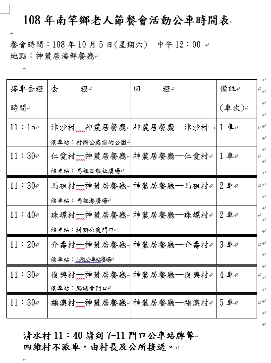 餐會舉辦場地為神辳居婚宴會館,請居住在南竿鄉65歲以上年長者們共同參加,另外鄉公所有公車接送,請鄉親於指定時間到指定處所搭車(搭車時間請注意村長廣播)。