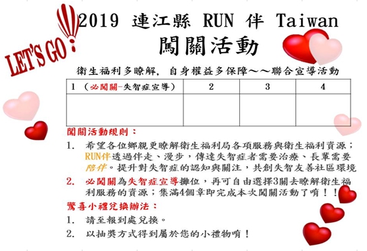 感謝各位報名參加由連江縣衛生福利局所舉辦2019 RUN伴活動,提醒您活動於10月6日星期日6:40在福澳運動場進行報到並領取物資,7:30進行RUN伴活動的規則及健行路線講解,為確保活動進行流暢,請各位於7:30前完成報到手續,謝謝大家的配合。