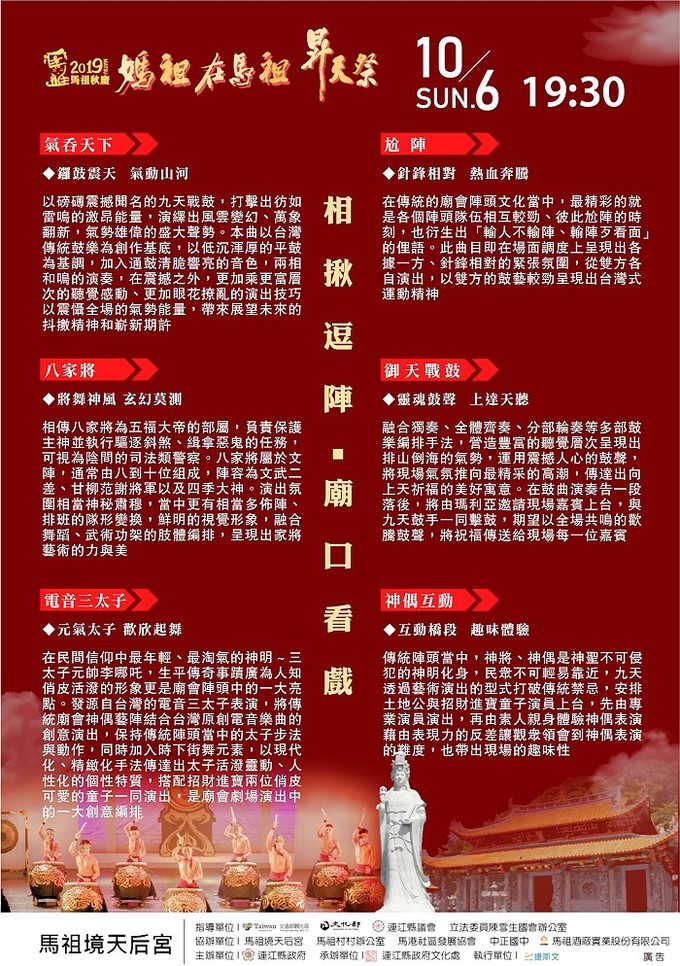 【記者曹重偉報導】2019媽祖在馬祖昇天祭今熱鬧登場,享譽國際知名藝陣團體九天民俗技藝團,應邀於6日晚間7時30分在馬祖境天后宮廣場演出,特別以廟會劇場為基礎,為媽祖在馬祖昇天祭量身打造具國際演出水準的藝陣表演節目,精彩可期;晚會結束後,縣府於21時30分安排有馬港至福澳碼頭的交通接駁車及22時福澳碼頭至白沙碼頭的夜航交通船,歡迎多加利用。