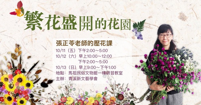 繁花盛開的花園名師張正苓請您來壓花 --閱讀人次 : 1220 青溪新文藝學會文化處藝文補助「藝花藝島嶼」計畫,將于10/11~10/13日為慶祝國慶日連假,邀請目前在大陸火紅的台灣壓花名師張正苓來馬祖教學,喜愛壓花的鄉親請不要錯過!