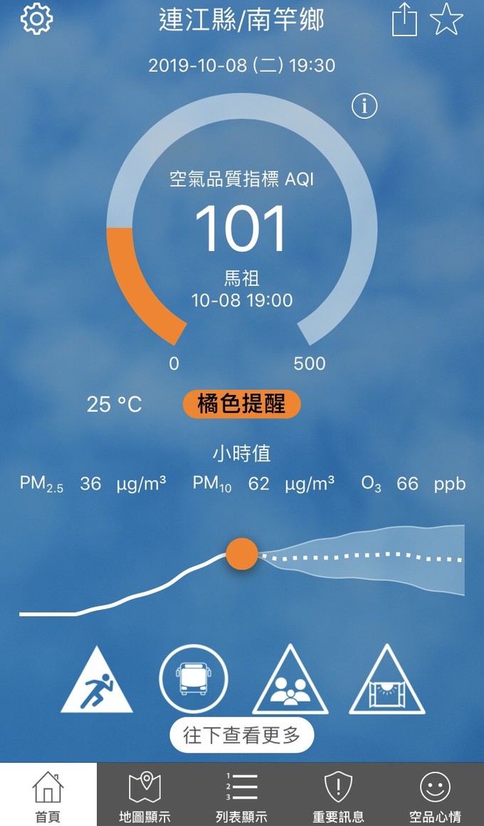 依據環保署今日(10月08日)下午19時空氣品質監測結果,馬祖地區受境外污染物影響,空氣品質指標AQI為101,對敏感族群有影響,環境資源局提醒您