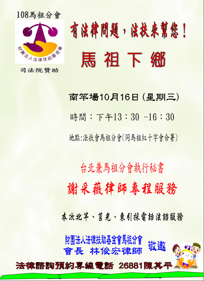 10/16(三)律師馬祖下鄉法律諮詢服務
