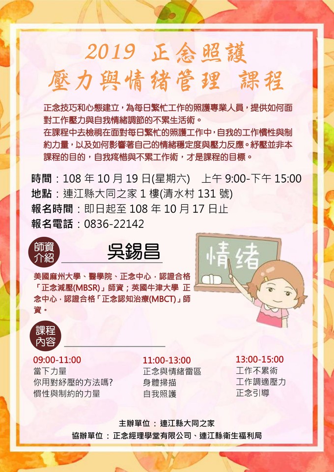 10/19 面對壓力不知道該怎麼辦嗎? --閱讀人次 : 738 2019正念照護-壓力與情緒管理課程