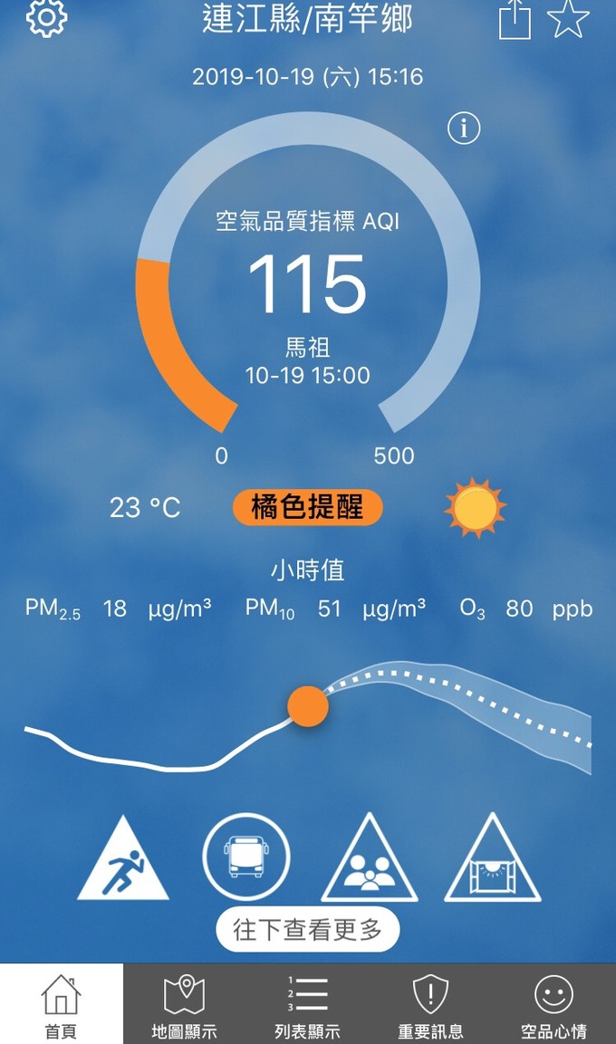 依據環保署今日(10月19日)下午15時空氣品質監測結果,馬祖地區受境外污染物影響,空氣品質指標AQI為115,對敏感族群有影響,環境資源局提醒您