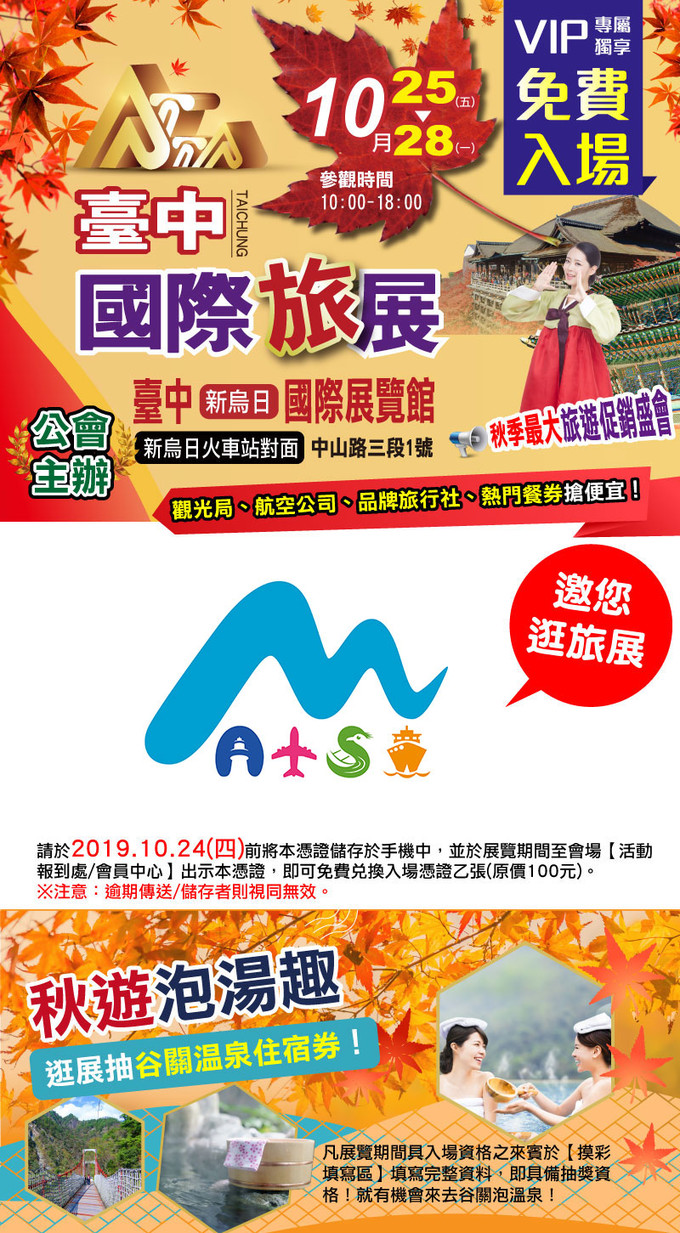 2019台中國際旅展 免費入場券送給你 --閱讀人次 : 869 2019 ATTA臺中國際旅展就在本週五展開,連江縣政府在「A30-A31馬祖形象攤位」邀請你來同歡!現場只要參與「卡蹓轉很大」遊戲就有機會獲得限定版「小鎮漫遊環保餐具袋」;還有各種伴手禮試吃,包括今年榮獲2019農村好物的馬祖好食「淡菜仙貝」、林義和工坊醇厚帶勁的「紅糟料理醬」與「XO蘿蔔辣醬」、雲津茶坊的「馬祖平安茶」等,讓你一試成主顧,把馬祖特色風味通通打包帶回家。