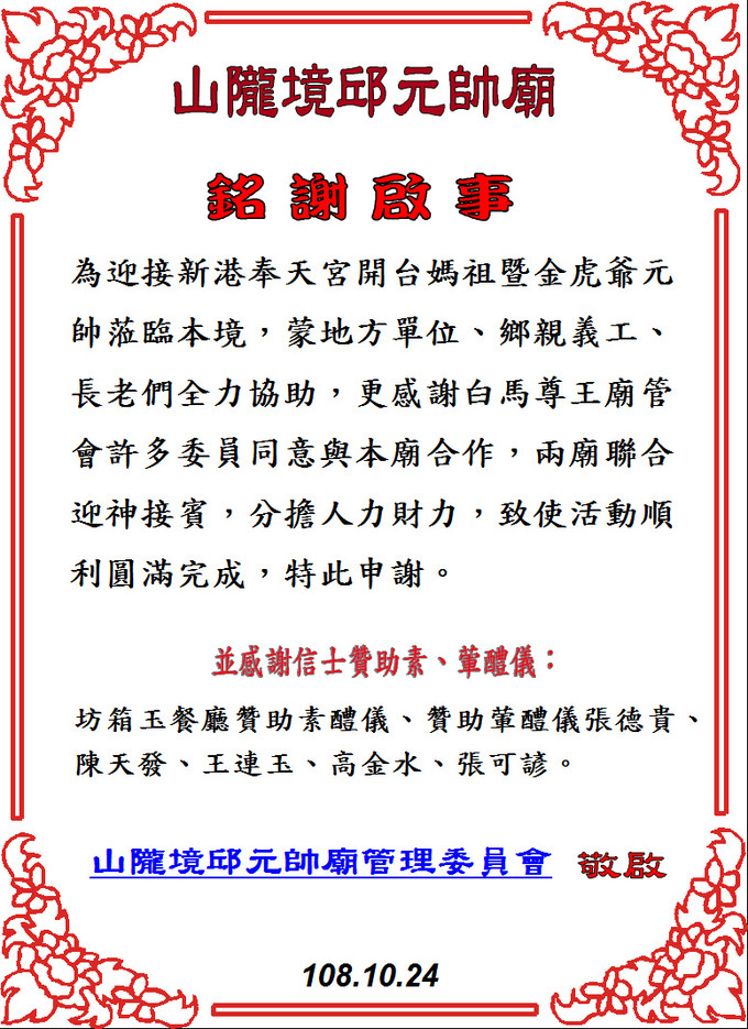 山隴境邱元帥廟管理委員會 銘謝啟事