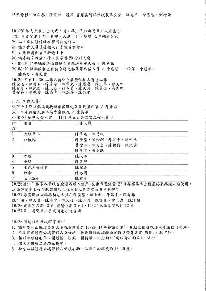 1.請有參加山隴境華光大帝祝壽團員於10/26日(早餐請自備),8點至福澳旅運大樓服務台報到。